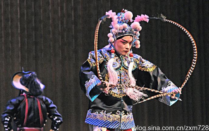 (3)《芦花荡》可分成几个段落,先是张飞腰插令旗上场走边,潜行于芦花之间。这出戏主要就在看演员的身段。演出张飞精气神饱满,潇洒与圆容的劲道。