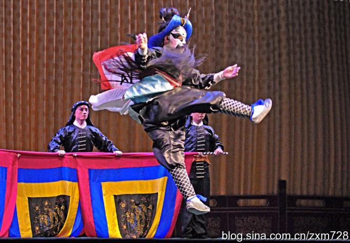 (4)“草笠芒鞋渔夫装,豹头环眼气轩昂;跨下乌骓千里马,丈八蛇矛世无双”。这出戏张飞的脸谱是笑脸的勾法,而不是打戏中的威猛。显示了张飞赢得轻松愉快。