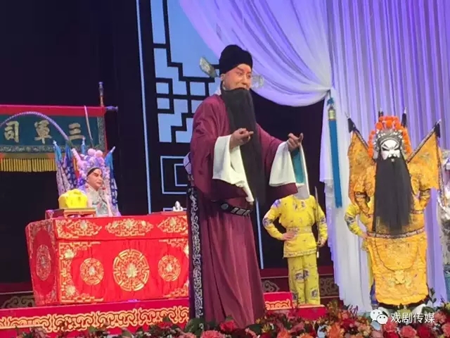 首场拜相,相爷乔玄上场念引子:丹心镇国,扶君王,社稷安康。由王英会老师饰演的乔玄一上场,映入观众眼帘的是扮相端庄典雅,身高、体型、容貌都非常符合国老的身份!先生嗓音宏亮,吐字清晰,所以开口的引子和诗句都深深地吸引着观众,俯耳静听,送入耳内!当皇叔过府拜访走后,自己念白:孙刘两家若能结亲永结盟好,一同出兵共敌曹操,与我东吴是大大的有利。但反之一想恐怕刘备过江有诈,才有了进宫见国太的一折!国太上场稳步移动显示出自己的身份!坐定念引子:桑榆暮景,愿尚香得配良缘。这为后面相亲促婚做了铺垫。宫殿议婚即在国太面前,孙权与乔玄的舌战:孙权阻止,乔玄力促,中间有一段观众非常熟悉的乔玄由二六转流水的唱段:劝千岁杀字休出口……共有26句,王老师运用优美的旋律和唱腔唱完,获得全场观众热烈的掌声和欢呼声!当国太决定甘露寺相亲后,才引发太尉回府思前想后如何促其成功,有了将须髪染黑的送药一折!