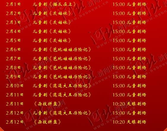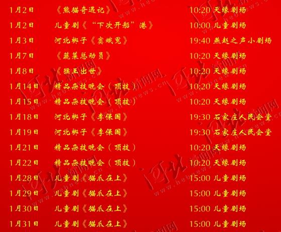 承德话剧团将于12月21日在石家庄人民会堂推出新创话剧《成兆才》;河北省杂技团将推出2场杂技精品晚会和《白雪公主》《熊猫历险记》《蔬菜总动员》《猴王出世》等杂技儿童剧。河北省歌舞剧院将在12月26日举办新年民族音乐会;河北省话剧院将于2017年1月28日到2月12日春节假期连续推出《穿靴子的猫》《寻喵启事》《邋遢大王》等16场儿童剧。