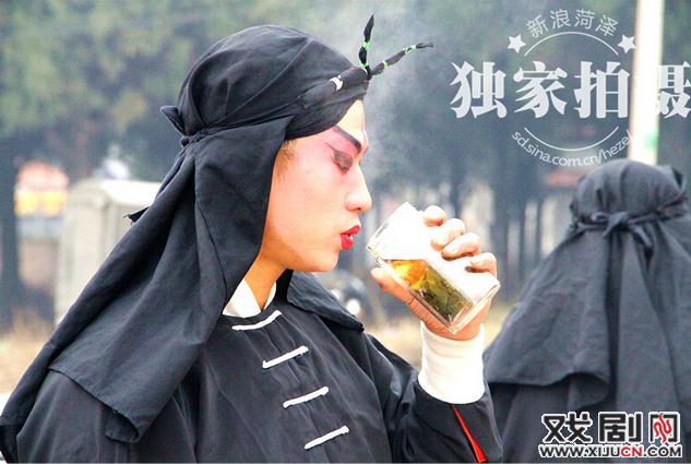此时的体感温度是零下5度,戏外的人都裹着羽绒、厚棉衣,而他们这戏里的演出人员只能穿着薄薄的戏服。在场下的时间顾不上再穿衣脱衣,只能喝热水御寒。
