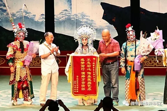 演出期间,很多保定市河北梆子剧团的业内同道,每场都来观摩学习并给予了高度评价;戏迷的口碑良好,热度有增无减。其中16日的演出再告满座,有一些专门从北京远道而来的观众,为看戏开车专程赶上,令人动容。比起上一站,保定之行观众反响更好且十分热情,演出结束后仍有二三百戏迷迟迟不肯离去,强烈要求返场。团长王洪玲和张树群分别演唱了《大登殿》中“龙凤阁内把衣换”和“金牌调来银牌宣”两个经典唱段,王洪玲代表剧团对保定戏迷表示感谢。大量戏迷涌到台上,争相与艺术家们合影。与此同时,保定市徐水戏曲之家赠送了一面锦旗,锦旗上赫然铭刻着“不忘初心,传承民族艺术;逐梦前行,演绎万古情怀”两行金字,无疑是对剧团的激励和鞭策。一些保定的观众则表示意犹未尽,还没看过瘾,真希望北京市河北梆子剧团能再多演几场。