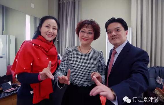王洪玲、刘文静、李斌在化妆间进行戏曲交流。