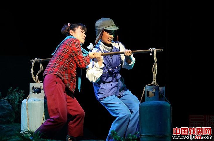 《挑山女人》开戏不久,就把人们带进了苦味汤中:新婚没几年的王美红生下了一个盲孩子,两年后又是一双龙凤胎降临到这个不太富裕的山里人家中;添了三张嘴巴,多需要多点钱进账时,大祸从天降,家中的顶梁柱丈夫坠山而亡……编剧的确很懂得观众的看戏路道及悲剧欣赏心理,波浪式地安排情节,设置泪点,让观众在刚擦拭掉眼泪不久,以为能舒口气时,又让你再一次眼泪情不自禁地流下来。一而再再而三,直到一个个哭红了眼圈,走出剧场边想不通“格个女人哪能介罪过啊”,边却感叹“今天真是看了一只好戏!”