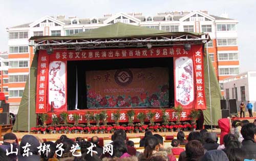 为进一步扩大送戏下乡辐射面,提高巡回演出的机动性,减少基层乡镇农村接待戏曲院团的负担,满足广大农民群众观看山东梆子的需求,在泰安市文广新局大力支持下,泰安市山东梆子剧院投资50万元,新购置大型舞台演出车。该演出车可提供台口宽13.5米,纵深10米,共135平方米舞台面积,系目前省内最大的舞台演出车之一。演出车展开后,表演区、乐队、灯光音响、后台服装与化妆均在演出平台上,大大方便了演出工作,减轻了演职员的劳动量。
