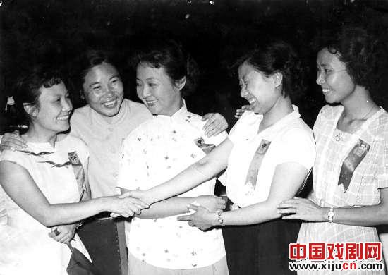 1960年全国第三次文代会上,姚璇秋与著名电影演员白杨(左一)、著名豫剧演员常香玉(左二)、武汉汉剧著名演员陈伯华(中)、赣剧著名演员潘凤霞(右二)等合影