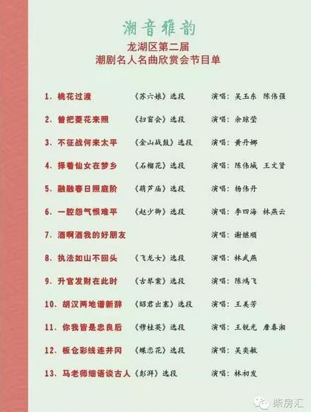 潮音雅韵·龙湖区第二届潮剧名人名曲欣赏会”则将于9月28日晚上8时在翰苑剧场举办。届时将由广东潮剧院派出林初发、吴奕敏、陈鸿飞、李四海、林武燕、陈伟城、林燕云等十几位潮剧名角登台献演。其中多位均属国家一级演员,且屡获国家和省级奖项,代表了目前潮剧界不同行当的顶尖水平,可谓群星璀璨、阵容强大。而他们献唱的曲目也多是潮剧经典名曲,如《苏六娘》选段《桃花过渡》、《赵少卿》选段《一腔怨气恨难平》、《蝶恋花》选段《板仓彩线连井岗》、《澎湃》选段《马老师细语谈古人》.....(来源:龙湖区文化馆)