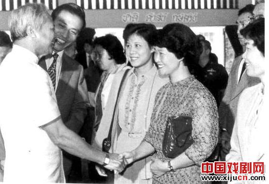 1986年中秋,时任泰国总理、泰中友好协会主席察猜与哈春旺少将在曼谷月宫大戏院观看中国广东潮剧团演出后,与剧团领导、演员亲切握手、交谈 (相片提供者:谢鹏生)