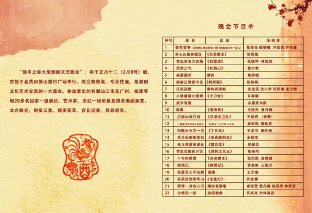 潮剧文艺晚会规模大、规格高,专业性强,将是一次潮剧艺术界文化交流之盛会。参加演出的将有潮汕三市及福建20多位一线当红潮剧表演艺术家及知名票友:郑健英、张怡凰、詹少君、王少瑜、余琼莹等登台献艺;国家级歌唱家许岚岚将为潮汕乡亲唱响新春祝福之歌……可谓群芳荟萃贺春饶平,万众同乐黄冈欢歌。