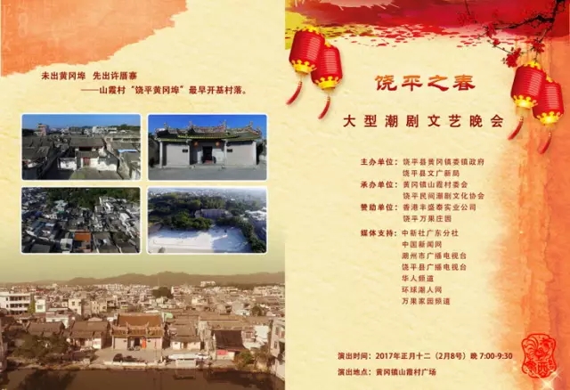 据悉,潮剧演唱文艺晚会由饶平县黄冈镇委、镇政府,饶平县文广新局主办;黄冈镇山霞村委会、饶平民间潮剧文化协会承办;香港丰盛泰实业公司、饶平万果庄园提供赞助。