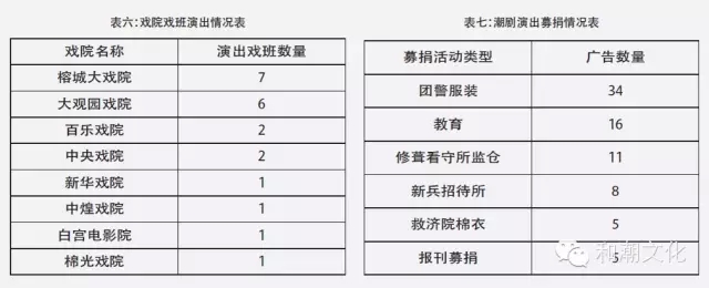 按照潮剧演出性质的不同,潮剧广告总体可以分为两种类型:普通潮剧演出广告和游艺募捐潮剧广告。普通演出广告是由戏院组织的普通演出,不以各种政治性为目的的潮剧广告,这一类型的广告占绝大多数。游艺募捐潮剧广告的目的非常明确,就是通过组织潮剧演出或以潮剧演出为主的游艺活动,主要为各种政治性主题的需要筹集资金的广告类别,地点可以在戏院也可以在公开场地。如1947年7月19日《揭阳青年报》刊登的两则潮剧广告,一是为“举行义演筹制夏季团警服”在榕城大剧院聘请老三正顺香戏班演出的广告,一是为“筹建新兵招待所”在榕城韩祠路公共运动场“一连六天”聘请老怡梨春班演出的广告。可以看出,以消遣娱乐为属性的潮剧演出活动已经成为政治性主题筹款的重要方式,并且为消费者所接受。
