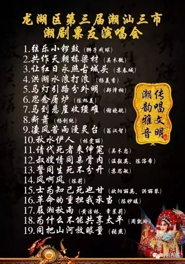 为贯彻落实汕头市委陈良贤书记关于创建全国文明城市工作的重要讲话精神,开展“文化环境提升行动”,进一步巩固龙湖区作为全国文化先进区的地位以及成为第一批广东省公共文化服务体系示范区的创建单位的工作成果。同时,贯彻落实《广东省政府办公厅关于促进地方戏曲传承发展的实施意见》和《汕头市政府办公室关于促进潮剧传承发展的实施意见》,由中共龙湖区委宣传部、龙湖区文广新局、新溪镇人民政府联合主办,汕头市潮剧票友会承办的《潮韵雅音,传唱文明——龙湖区第三届潮汕三市潮剧票友演唱会》将于12月9日晚在新溪镇西南村隆重举行。