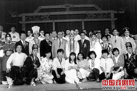 1986年11月,中国驻泰国大使张德维及夫人在曼谷月宫大戏院观看广东潮剧团演出《救风尘》后,上台与全体演职员合影。(相片提供者:谢鹏生)