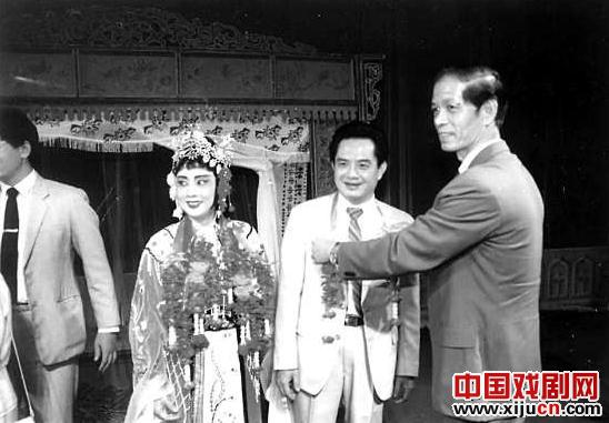 1988年,中国驻泰国大使馆总领事张伟超为出访泰国的广东潮剧团副团长黄顺提、潮剧名演员姚璇秋挂花串。(相片提供者:黄顺提)