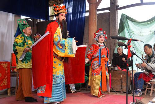 3月23日,雁江区新场乡双河村仿佛一座空村,一路未见一个村民。在村子的另一头,一座略显陡峭的山上,百余个村民正围聚在山腰的观音庵前,看陈建国带领着他的建东川剧俱乐部表演的川剧曲目。