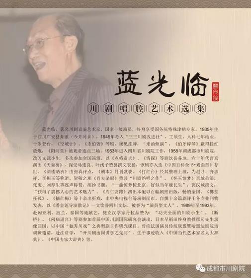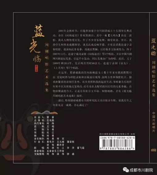 7月8日,《蓝光临川剧唱腔艺术选集》首发仪式将在锦江剧场举行,戏迷朋友们在现场就可以购买到这一由著名川剧表演艺术家蓝光临,于2007年至2014年期间录制的艺术选集。该选集包含蓝光临《问病逼宫》《访友》《上关拜寿》等10个珍贵唱段。届时,著名川剧表演艺术家蓝光临也将亲临现场。为庆祝这一川剧盛事,蓝光临的弟子们将在当天下午2点,在锦江剧场举行专场祝贺演出。