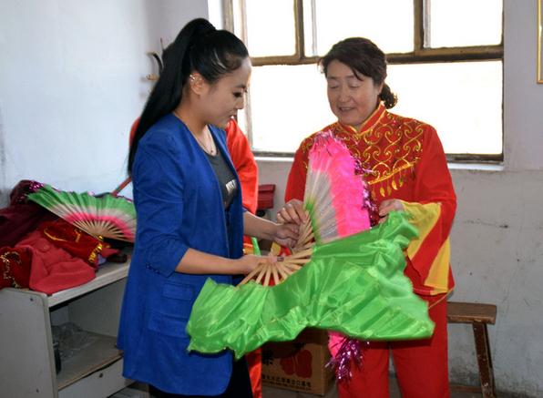 走进乌克忽洞镇文化大院,你会看到这样一幅画面:在两位二人台“老师”的带领下,一群年过花甲的大爷大娘们在练习着二人台演唱和表演的技巧,十余个10岁左右的图为党雪荣正在指导老百姓孩子正在学着使用扇子、手绢和霸王鞭等二人台道具……