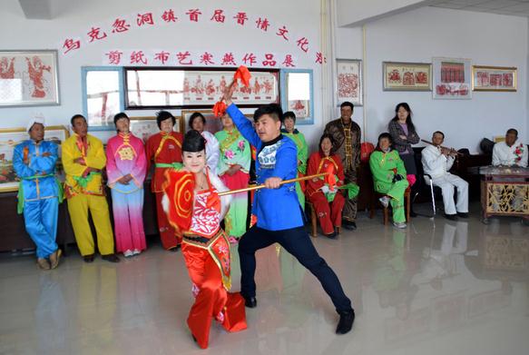 这两位二人台“老师”,男的叫王顺利,女的叫党雪荣,他们是今年达茂旗政府为农区乡镇文化站特招的文化辅导员。平日里他们二人一起琢磨演唱和表演技巧,创新编排节目,在每周的二、四、六晚上,就会走进乌克镇的六个文化大院,跟同样喜爱二人台文化的农民们欢聚在一起,帮他们熟悉动作、纠正发音、合成伴奏、编排节目。同时,二位“老师”还从附近村里召集了十几个八到十岁的小朋友,利用周末时间教孩子们使用二人台道具,从娃娃抓起,让小朋友们喜欢上二人台,让二人台艺术能代代传承。在记者与王顺利交谈时,他憨厚的说道:“就希望帮助乡亲们能够延续对于二人台的这份热情,希望作为非物质文化遗产的二人台能够拥有更广泛的群众基础并代代相传。”