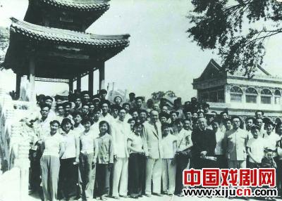 1958年,乌兰夫与剧团全体演职人员一起在北京颐和园合影。