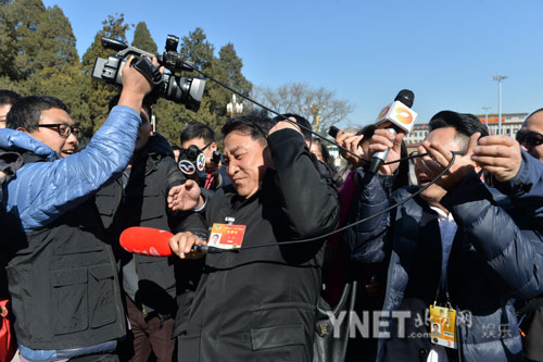 北京,全国政协十二届三次会议在北京人民大会堂举行闭幕会。政协委员赵本山进入会场前被记者追拍,几次回身感谢记者,并鞠躬、挥手,还提醒记者不要拥挤摔倒。而姜昆中途在接受记者围住采访时,因为人多拥挤被话筒线缠住。
