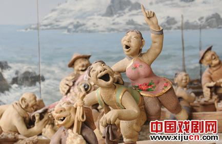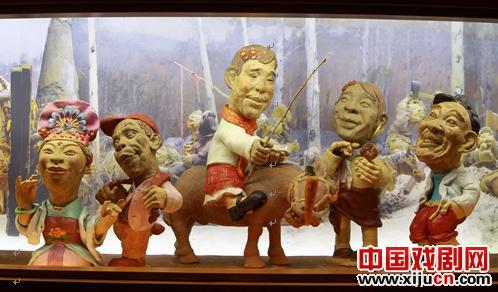 汉方对黑土文化和二人转并不陌生,因为他的小学时期是在东北乡间度过的,加上又是本山老师的铁杆“粉丝”,所以创作起来并不显吃力。2010年夏天,汉方把“陶艺二人转”摆在了沈阳本山传媒基地。近50件作品组成了二人转的“屯场戏”,一下子就把本山老师吸引了:在东北人家热闹的屯场里,一对二人转演员边唱边浪,围观人群千姿百态,有忘我看戏的,有借机打情骂俏的,还有手拿酒瓶边看边斗酒的,以及周围叫卖的小贩、牵牲口的老汉……