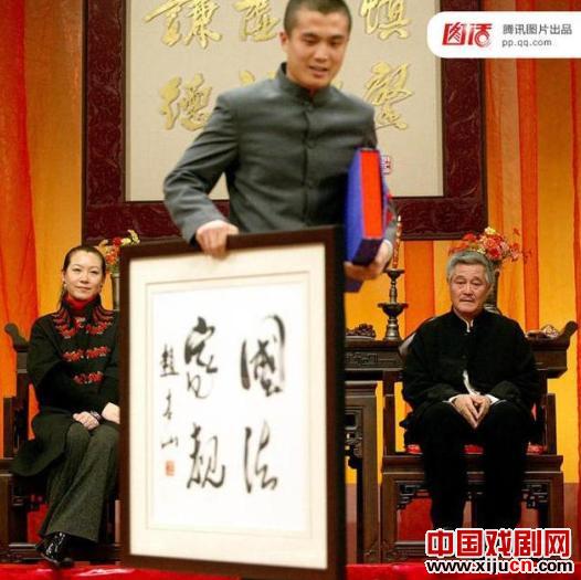 “我把丑话说在前头,做我的徒弟首先是要做好人,你们当中要是有人做人出现问题,我可要不客气地清理门户。”在徒弟们心里,赵本山是绝对的权威。为了树立起内部严格的规矩,赵本山会赠送徒弟和下属写有警句和格言的墨宝或石刻,以显示“规矩的分量”。图为2008年,收徒仪式现场,赵本山及其妻子马丽娟(左)。