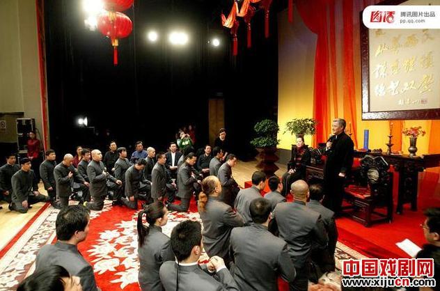 2008年2月11日,赵本山举行收徒仪式,共收徒35名。赵本山向徒弟以及公众解释收徒目的时说:“我收你们的目的,不是为了有几个徒弟整天围着我转,而是为了二人转这个艺术形式更好地发展。”图为收徒仪式现场,徒弟们向赵本山行礼。他们中,包括了日后成名的“小沈阳”、王小利等人。