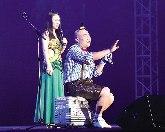 大程子(程野)和他的搭档郝莎莎登台表演,掀起晚会第一个小高潮。大程子标志性的假牙加上头顶小wifi造型,让人看到就忍俊不禁。他表演了一段乐器独奏,演奏的是电视剧《红楼梦》的主题曲《枉凝眉》,吹得那叫一个如泣如诉。之后,他又以一段“销魂”的印度舞令大家捧腹大笑。