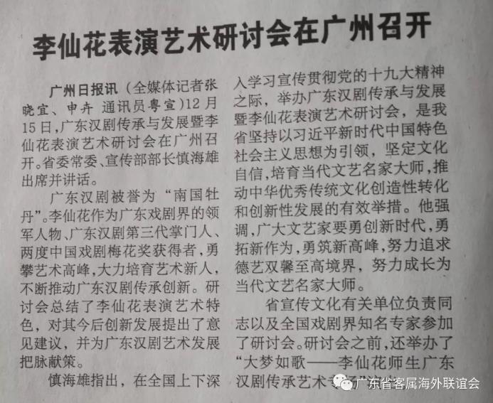 2017年12月14日晚,国家一级演员、客属著名汉剧表演艺术家李仙花师生共同合作表演的《大梦如歌》艺术专场在广东省粤剧院隆重举行。广东省客属海外联谊会(简称:广东省客联)执行会长钟闻东与省内客属社团代表及各界群众近千人共同观赏了这场精彩的演出。