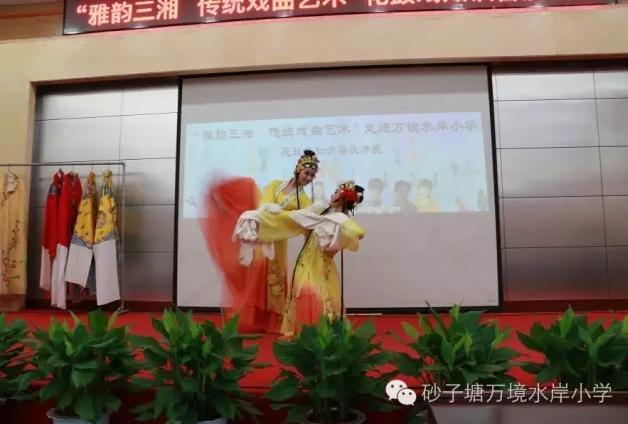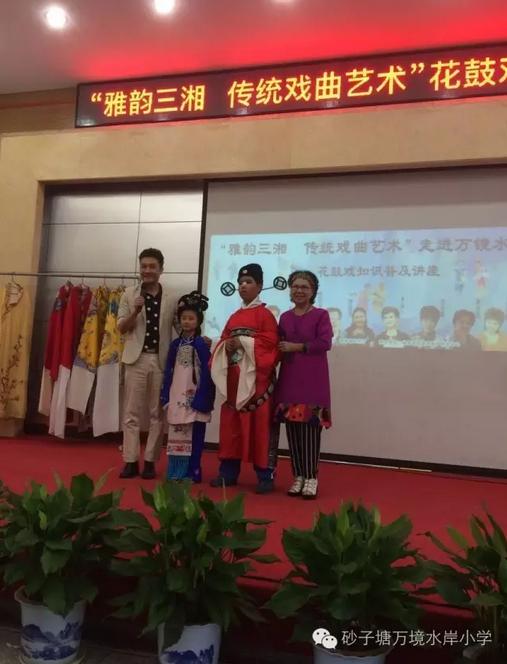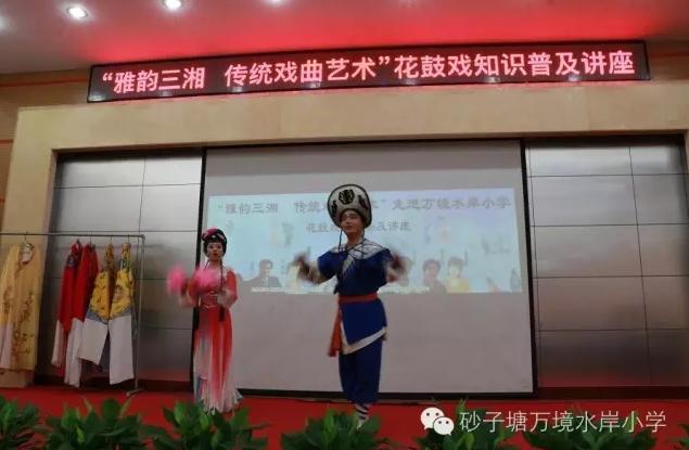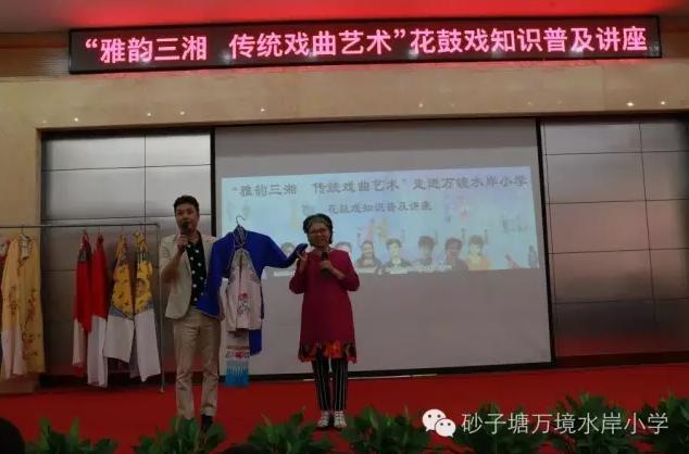 5月23日下午,砂子塘万境水岸小学二楼报告厅座无虚席,锣鼓喧天,热闹非凡,原来是由省委宣传部、省教育厅、省文化厅主办的“雅韵三湘•传统戏曲艺术‘进校园花鼓戏知识普及讲座”走进了砂子塘万境水岸小学校园。