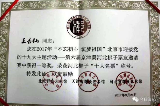 近日,由清苑区文化馆选送的河北梆子票友王杏仙、吴书忍两位选手,在代表河北省参加的天津“银达子杯”河北梆子票友大赛中,荣获“十大名票”称号;在北京举办的“第六界京津冀河北梆子票友大赛”中,二人双双荣获一等奖和河北梆子“十大明票”称号。清苑区文化馆在以上的两次活动中分别荣获“优秀组织奖”。