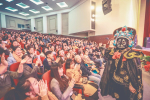 2日晚的演出定在7点开始,但刚过6点半便有同学进场占位。等到演出开始前,上千人的剧场内早已座无虚席。第一个节目是戏曲舞蹈《春色满园》,市川剧研究院的青年舞蹈演员们刚一亮相,她们精美的服饰和妆容立即引来台下一片喝彩。随后,中国戏曲最高奖“梅花”奖得主王超带来川剧戏歌《梅花绝句》,高亢有力的唱腔也博得台下阵阵掌声。舞蹈跳得好、戏歌唱得好,成都市川剧院的艺术家们还有绝活,比如国家二级演员罗兴康带来的川剧木偶戏《白鳝观景》。半人高的木偶在罗兴康手中灵活自如,耍翎子、摘花、令人拍案叫绝;京胡演奏《夜深沉》配以美不胜收的长绸舞,插科打诨的川剧小品《九流相公》都收获了阵阵掌声。