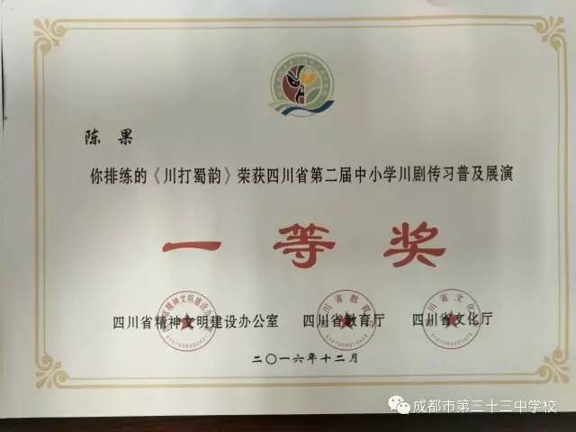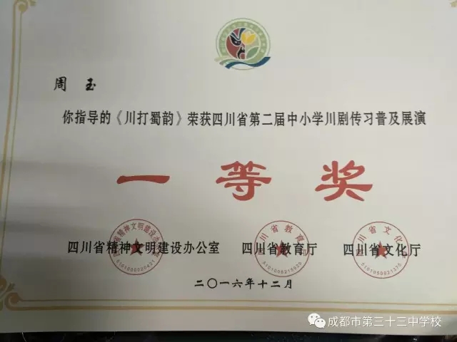 我校川剧节目《川打蜀韵》在由四川省精神文明办公室、四川省教育厅、四川省文化厅联合主办的“四川省第二届中小学川剧传习普及展演”活动中,荣获一等奖。我校陈果老师和成都市川剧研究院周玉老师荣获排练指导教师奖。