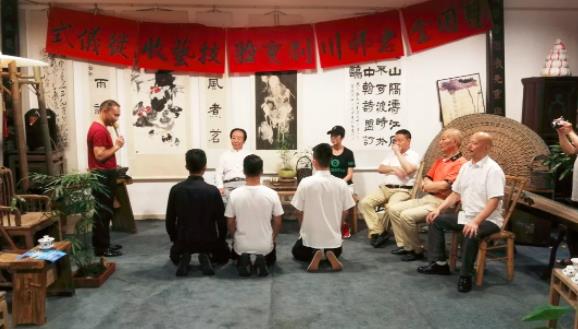 翟国全端座在竹椅上,精神抖擞地亮相,接受三位弟子的跪拜,三位新入门弟子分别是1995年出生的优秀青年变脸演员曹飞;1998年出生的优秀青年川剧演员刘林松;1999年出生的甘肃人、国家二级武术运动员,武术演员张宝。