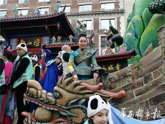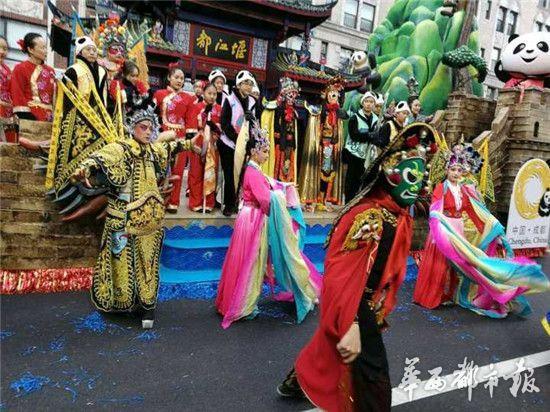 值得一提的是,今年游行队伍中还有中国元素,一辆成都旅游花车亮相队伍中。不仅有川剧脸谱,还有戴着熊猫面具的队伍。