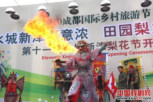 成都川剧团艺术家们为观众表演了川剧精品戏曲荟萃.梨园春,川剧高腔,川剧变脸吐火等节目为水城新津梨花节增加了不少声色。