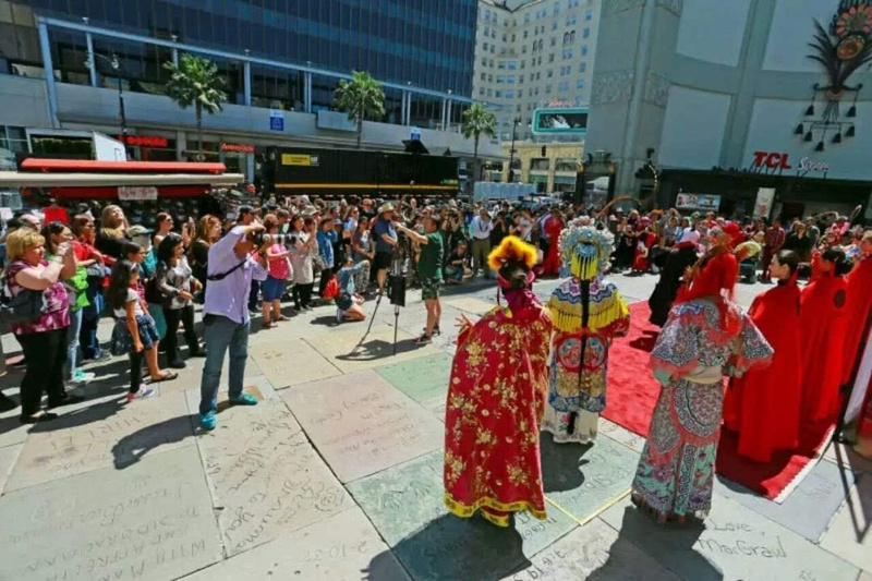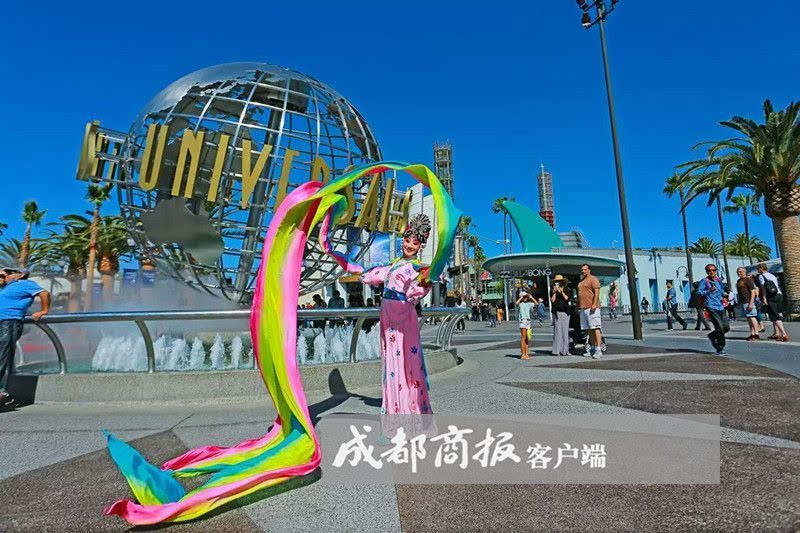 如果这一幕出现在成都,大家见惯不惊。可是,当这一切出现在美国洛杉矶星光大道上,立马就吸引了全世界的关注。这当中,中国戏剧梅花奖“二度梅”的获得者陈巧茹,身着粉紫色戏装,扮演成太阳神鸟靓丽登场。尤其是她手中十多米长的红黄蓝三色彩绸,迎风飘扬,在蔚蓝的天空中划出一道道美丽的图案,煞是好看。