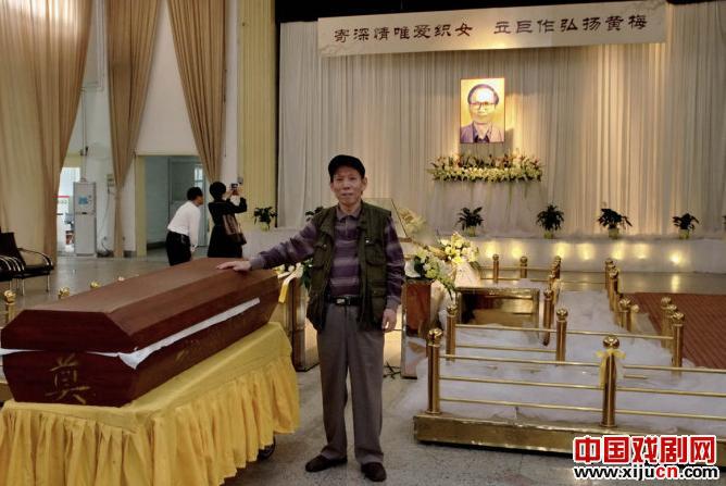 入大厅后,见主席台帷幕正中置冠亚兄大幅遗照,上方横幅挽幛文字为“寄深情唯爱织女 立巨作弘扬黄梅”,注目良久,一时难以评点,但不知何人所撰。大厅前部右上方悬有电子屏幕,正在交替播放逝者生前旧照及偕家人合影,音乐播放内容我不甚熟悉,后经了解,方知是冠亚兄生前名作黄梅戏《孟姜女》中“梦会”、“十二月调”和“新婚别”三个选段,演唱者陈小芳、吴琼、韩军等均为冠亚兄忘年交或高足。据云,此系小亚、小英等为悼念先父而特意选播。