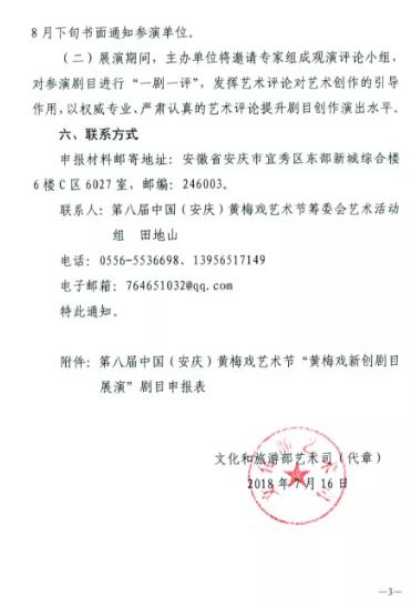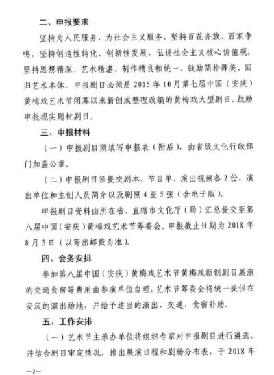 2018年7月16日,文化和旅游部艺术司印发《文化和旅游部艺术司关于第八届中国(安庆)黄梅戏艺术节“黄梅戏新创剧目展演”有关事项的通知》,全文如下: