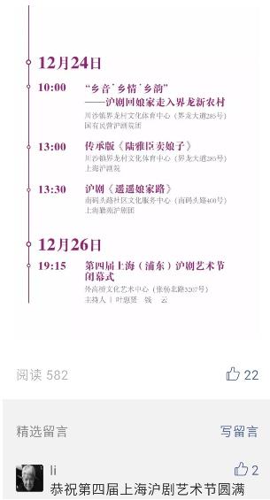 据悉:本届沪剧节将较前三届进一步突出“走近群众”的特色。今年,沪剧节期间上海沪剧院和各家民营沪剧团的演员组成的志愿者队分别深入浦东的各家福利机构、社区街镇,现场搭台,除安排“进社区、广场、到基层慰问点演出”外,还举办了2场以“东乡雅韵”和“乡音·乡情·乡韵”沪剧回娘家走入界龙新农村 为主题的混合折子戏演出,各院团都派出了实力唱将,将名家名段送到老百姓家门口。此外,长宁沪剧团著名演员黄爱忠将到北蔡中学举行《上海声音——沪剧》讲座,名家亲自辅导学生,以曲会友,以技传艺,体验沪剧带给老百姓丰富多彩的精神群众文化生活,这也是响应党中央践行“乡村振兴战略”的重要实践。用创造性的方式挖掘上海丰富的“红色文化、海派文化、江南文化”资源,以内容丰富、形式多样的创作佳品,展现上海文艺创作百花齐放的喜人场面,全力打响“上海文化”品牌,彰显文化自信。
