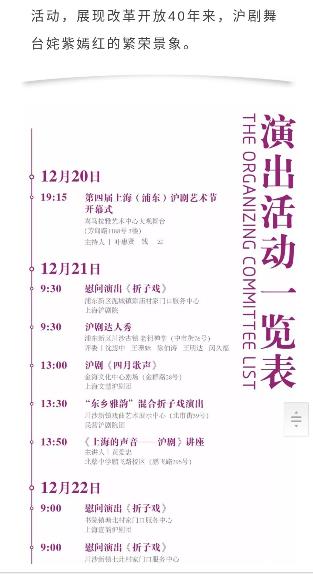 为纪念改革开放40周年,落实市委打响“上海文化”品牌的发展战略部署,全面深化“上海文创50条”政策措施,将“红色文化、海派文化、江南文化”融入到文艺创作中。上海沪剧院携手沪剧东乡调发源地浦东,第四届上海(浦东)沪剧艺术节开幕式结合“海纳百川、兼容并蓄”的上海城市特质,特邀国内知名歌唱家、长三角“滩簧”名角、国际友人等,与全市10余家专业沪剧团队的专业沪剧演员及长三角沪剧沙龙的沪剧爱好者们用艺术情怀对话,促进海派文化交流互鉴、薪火相传,现定于 2018 年 12月 20日—26日举办“第四届上海(浦东)沪剧艺术节”。本届沪剧节除开闭幕式外,共安排有7场折子戏慰问演出,8场大戏演出,2场混合折子戏,1场沪剧主题讲座,1场沪剧达人秀,达人秀通过网络报名人数达30余人,最大70岁,最小4岁。沪剧节正以国际的视野,利用沪剧的品牌效应,借助浦东的经济文化优势,共同寻求新发展,共同擦亮文化品牌,筑牢艺术高地。