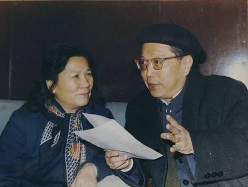 曹禺先生观看沪剧《日出》时与丁是娥亲切交谈