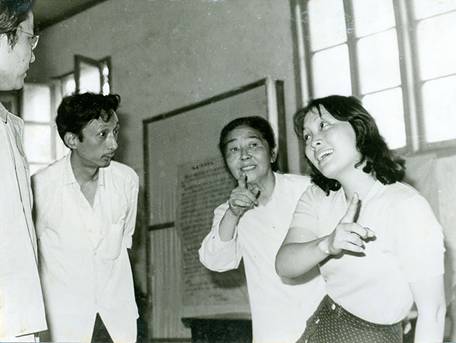 凌琯如(右二)为在沪剧《日出》中扮演陈白露的马莉莉(右一)说戏