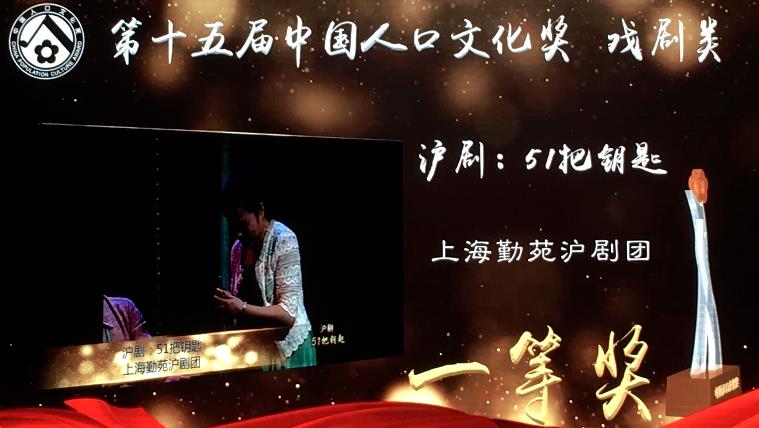 第十五届中国人口文化奖舞台艺术类获奖作品颁奖活动于12月18日在北京举行。本次评选活动共收到来自全国各省、自治区、直辖市报送的参评作品328件。组委会经过认真审议,评选结果揭晓,上海勤苑沪剧团原创沪剧:《51把钥匙》荣登榜首!获戏剧类一等奖!