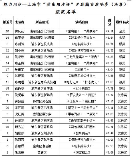 本次大赛前阶段通过戏剧网等媒体宣传与发动,得到全市不少沪剧业余爱好者的积极报名与响应,这些参赛者主要来自浦东川沙、南汇、静安区、金山区、崇明区等,通过11月22日下午与晚上两场初赛,经过专家评委的当场打分,认真筛选出20名选手入围参加决赛。决赛中,选手们各施所长,充分展示自己的演唱才能,现场掌声迭起。经过紧张激烈的角逐,来自川沙新镇的黄凤花、徐萍华选手发挥出色,获得了金奖;来自浦东新区航头镇的陈引芳、新场镇的胡小英与川沙新镇的姚淑琼获得银奖;来自川沙新镇的陈玉梅、吴建星、翁晓萍,浦东新区南码头街道陈瑞瑾、浦东新区合庆镇徐静华等获得铜奖。
