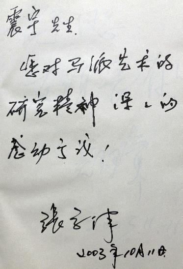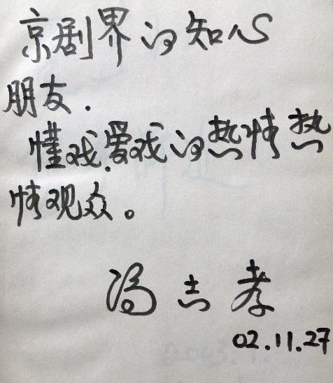 1999年夏,我被河北电视台《戏曲大观园》(后改称《戏苑乡音》)栏目制片人马元素吸纳加入栏目组,参与节目制作工作。这下,我可是如鱼得水、乐在其中了。尤其让我高兴的是,通过节目,我有幸结识了冯志孝、朱宝光、高彤等马派名家。2003年10月13日,我终于见到了当今马派艺术的领军人物张学津老师,那种激动兴奋的心情溢于言表;感于我对马派艺术的执着追求,张先生欣然为我留言:“您对马派艺术的研究精神深深的感动于我。”