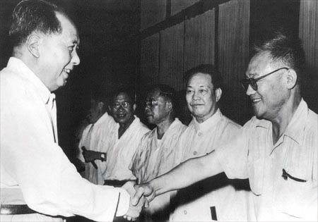 1956年,毛泽东接见文艺界著名人士,右二为周信芳