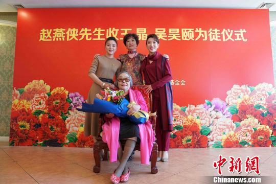 中新网北京9月18日电 (记者 潘旭临)九十高龄的著名京剧艺术大师赵燕侠18日在北京喜收王晶、吴昊颐为徒,并在北京戏曲艺术基金会的主办下举行了隆重的拜师仪式。