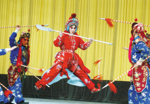 昨晚首先亮相的是由闫巍主演的《泗州城》。闫巍是国家一级演员,毕业于天津市戏曲学校,中国戏曲学院优秀青年京剧演员研究生班研究生,工刀马旦,曾受教于李俊麟、李金鸿、张春华、刘秀荣、白云明等名师,技艺逐年提高,先后主演了《竹林计》《扈家庄》《盗仙草》《借扇》《小放牛》《巴骆和》《泗州城》《大英杰烈》《杨排风》《青石山》和古装轻喜剧《牡丹巧戏仙》等。去年,她荣获了第二十五届“中国戏剧梅花奖”、全国京剧青年团(队)新剧目汇演“优秀演员奖”,并以《岳云》一剧,荣获“文华表演奖”。她还在全国青年京剧演员电视大奖赛中获得“最佳表演奖”,在第三届中国京剧节中荣获“优秀表演奖”,在第四届中国京剧节中,以《泗州城》一剧荣获武戏擂台赛金奖。她的扮相俊美,开打利落,塑造的水母一角,尽管是个神仙角色,但她表现了水母敢爱敢恨、不惧天兵天将的性格,赢得了观众热烈的掌声。