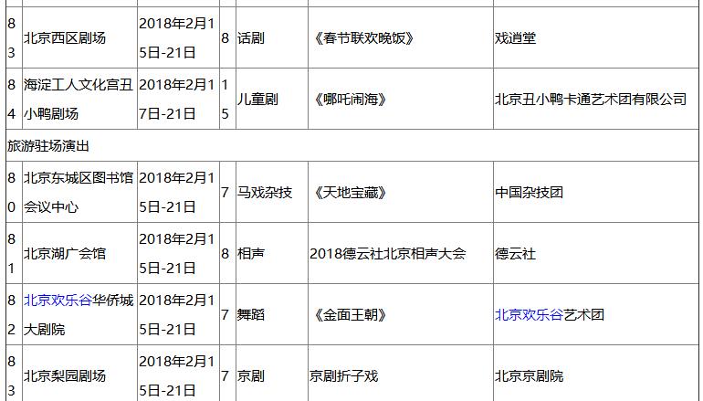 海淀剧院一改往常演开心麻花作品的常态,今年春节为观众献上“‘你说我笑’戊戌狗年”新春大拜年名家经典专场晚会,汇聚李金斗、李建华、李增瑞等著名相声演员;德云社、嘻哈包袱铺等相声团体将带来60余场演出,带领观众欢乐过大年。朝阳公园将推出“2018新春版朝阳公园大马戏”,这里将汇聚小朋友最爱的动物明星,有威风凛凛的狮虎、憨态可掬的黑熊、聪明淘气的美猴王以及卖萌搞笑的小狗等,它们各个身怀绝技,轮番上阵展示绝活,为观众开启一整年的好心情。